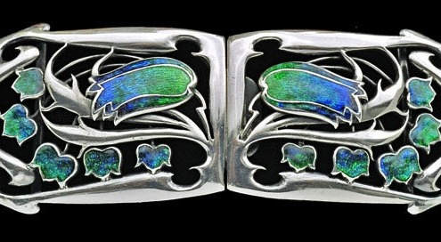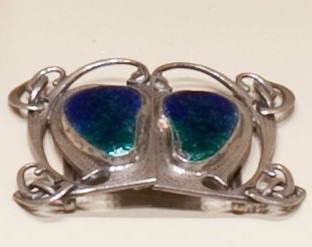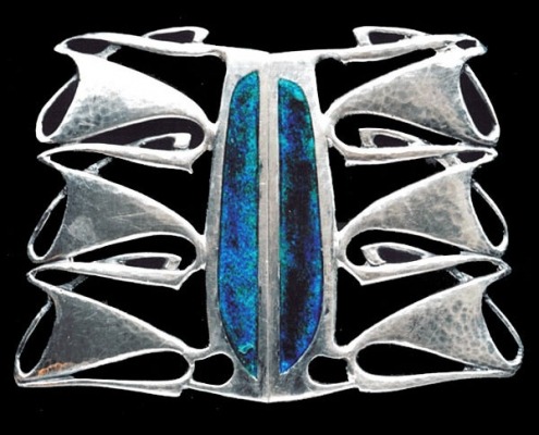 A very rare 7 1/2" wide x 1 1/2" tall Archibald Knox designed Liberty & Co / Cymric sterling silver and enamel carviar server that was made in 1904.